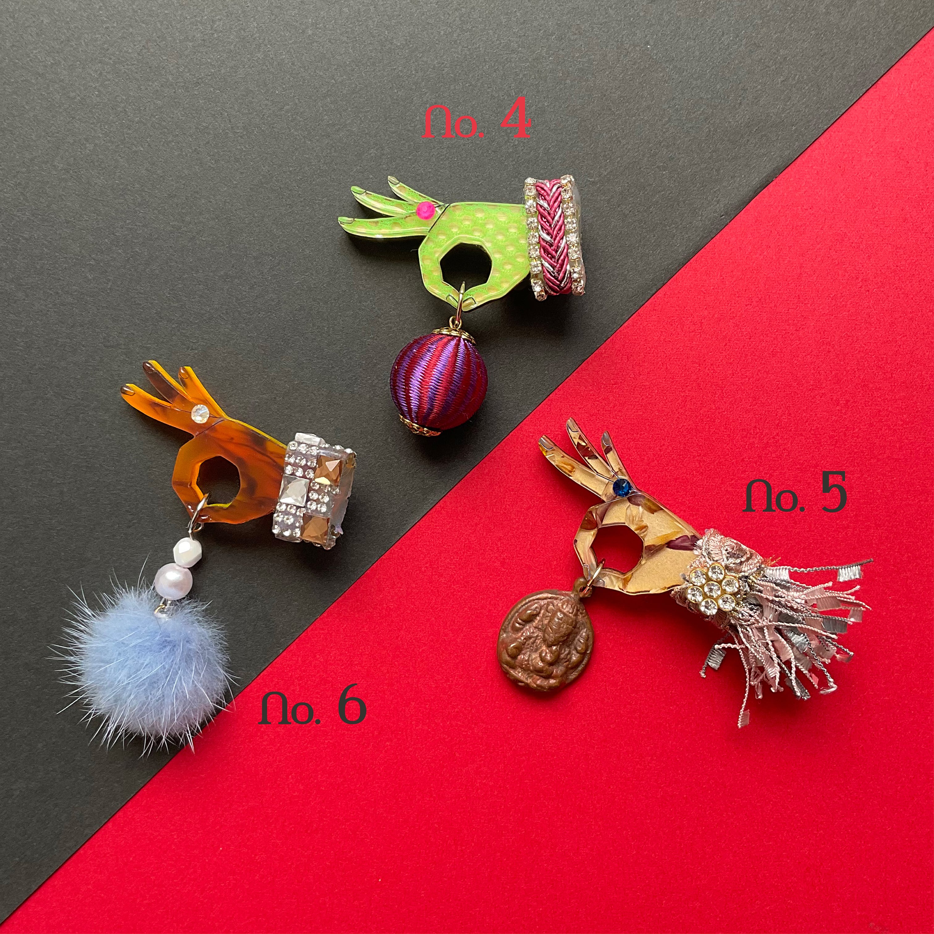 素材:木、アクリル、スワロ、ニット、ビーズ、金属(ブローチピン)